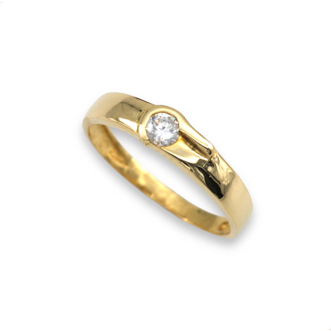 Sencillo anillo fabricado en Oro de 18 quilates tipo alianza lisa con circonita central, acabado pulido. Disponible pendientes a juego SKU80002710.