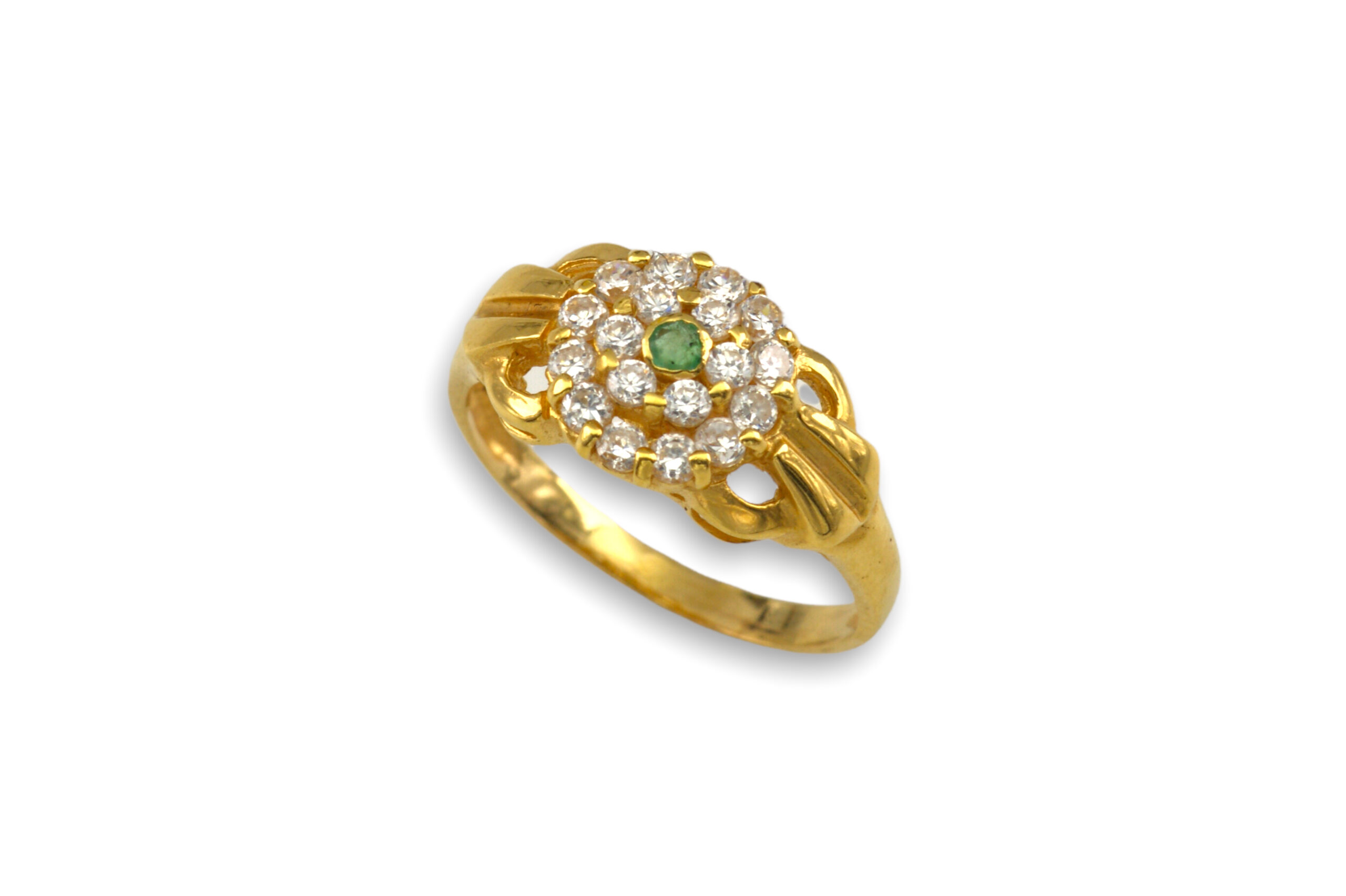 Anillo en Oro de 18 quilates con esmeralda en el centro y circonitas bien engarzadas a su alrededor, acabado en oro pulido. Disponible pendientes a juego SKU8000047.