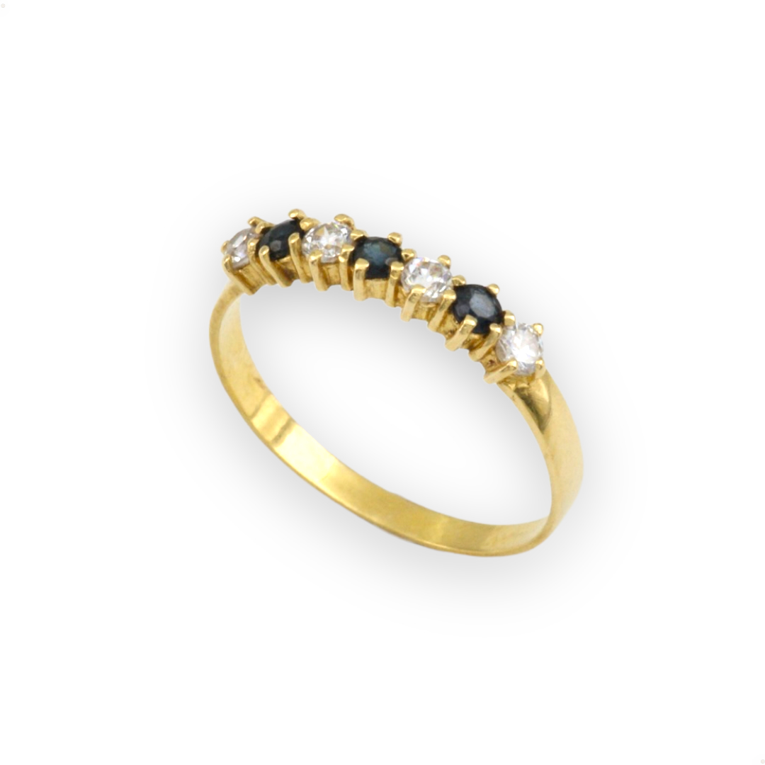 Sencillo anillo en Oro de 18 quilates que en la parte frontal intercala circonitas con piedras negras en talla brillante y engarzadas en garra, todo en acabado pulido. Una joya sencilla y elegante.