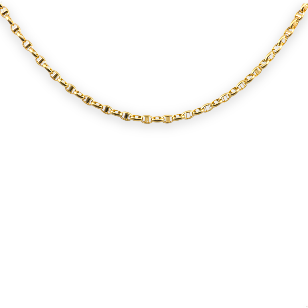 Cadena en Oro de 18 quilates con eslabón forzado con barra en acabado pulido. Cierre de mosquetón. Medidas: – Peso: 6 gramos – Ancho: 2,7 mm – Largo: 60 cm