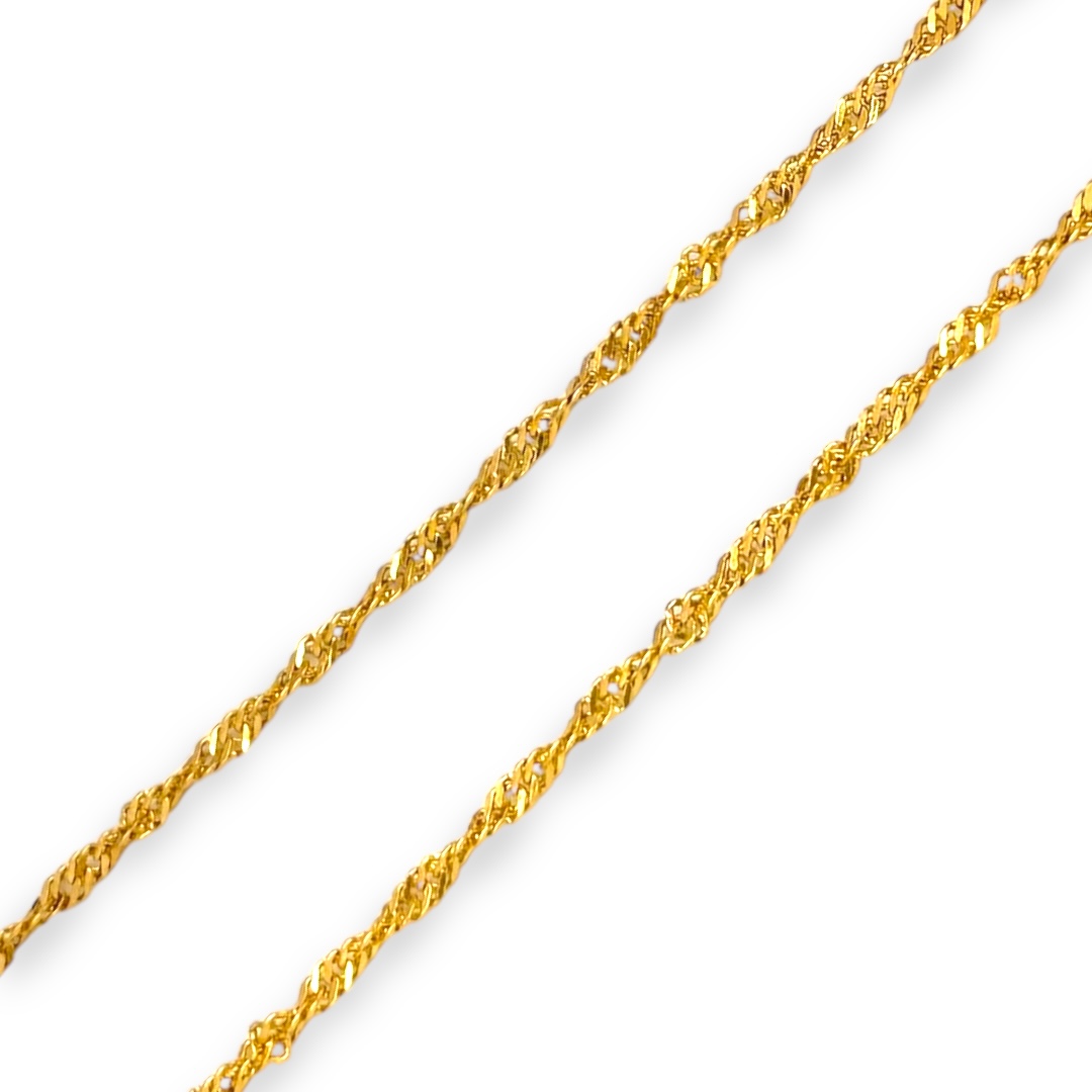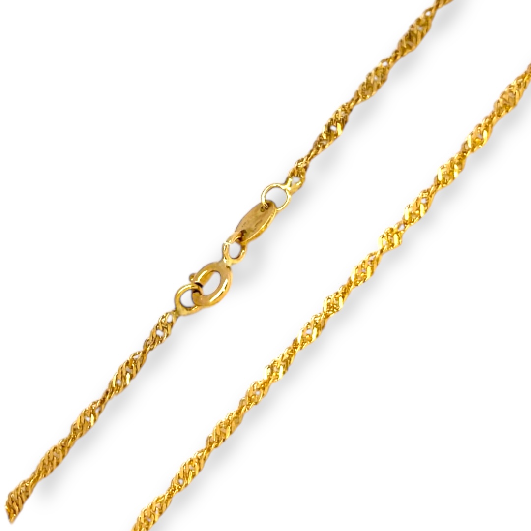 Cadena fabricada en Oro de 18 quilates con eslabón singapur y acabado pulido. Cierre de reasa.