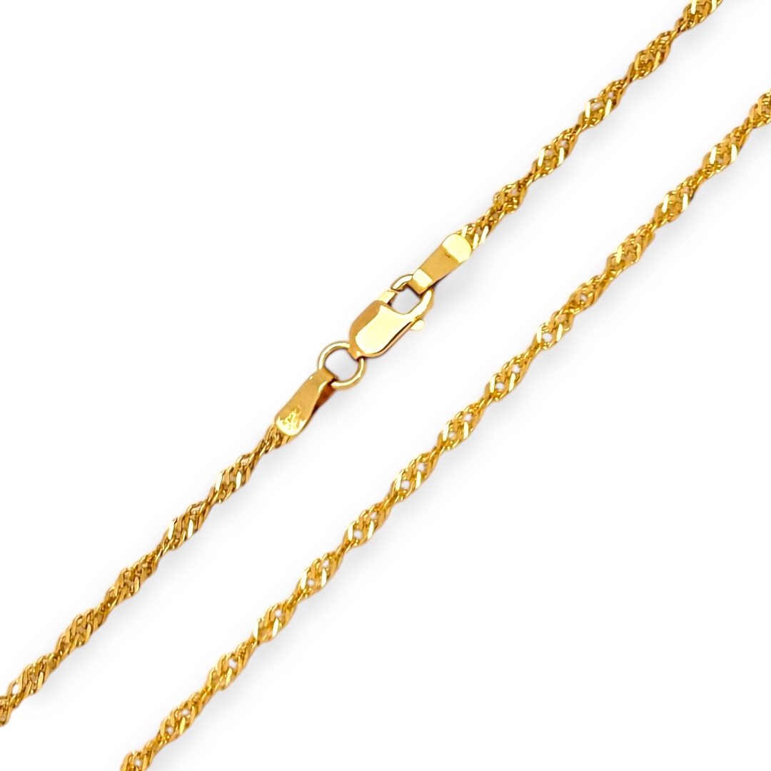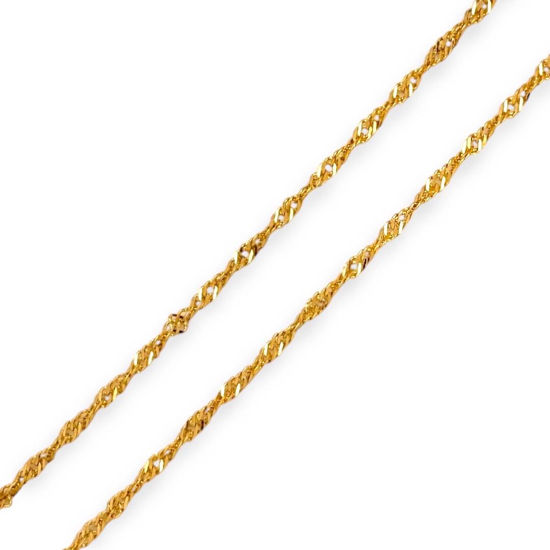 Cadena fabricada en Oro de 18 quilates con eslabón singapur y acabado pulido. Cierre de mosquetón.