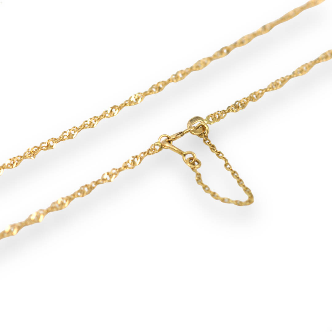 Cadena fabricada en Oro de 18 quilates en acabado pulido con eslabón singapur. Cierre de reasa y cadena de seguridad.