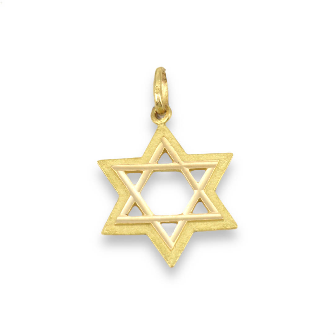 Colgante fabricado en Oro de 18 quilates con diseño estrella de David con un perfecto acabado pulido. Medidas: - Peso: 2 gramos - Diámetro: 2,3 cm