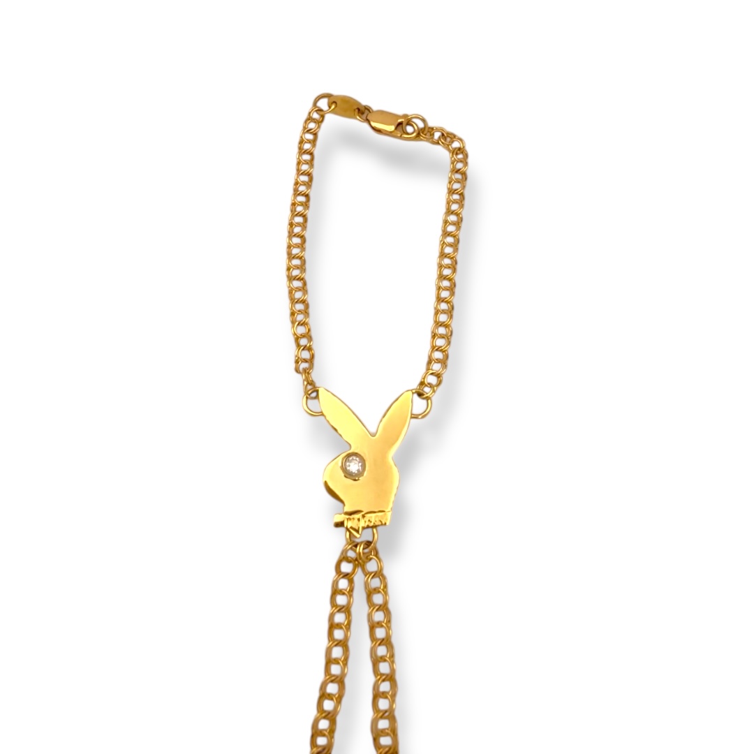 Manita fabricada en Oro de 18 quilates con un conejo y una circonita en el ojo que se une a la muñeca con cadena de eslabones garibaldi y al dedo corazón con cadena garibaldi en un brillante acabado pulido. Cierre de mosquetón.