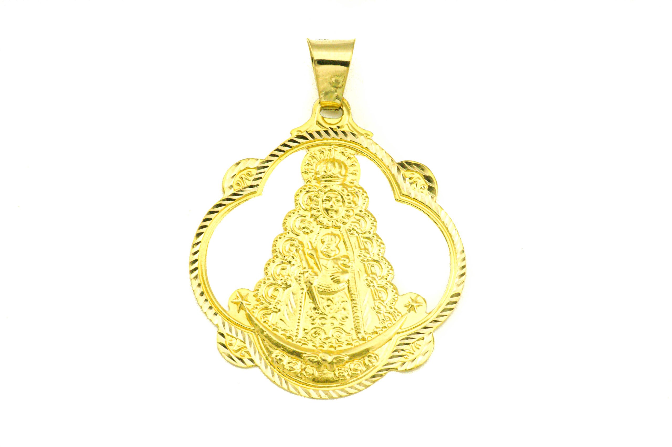 Preciosa medalla de la Virgen del Rocio en Oro de 18 quilates con bonito grabado rayado a su alrededor y acabado pulido.
