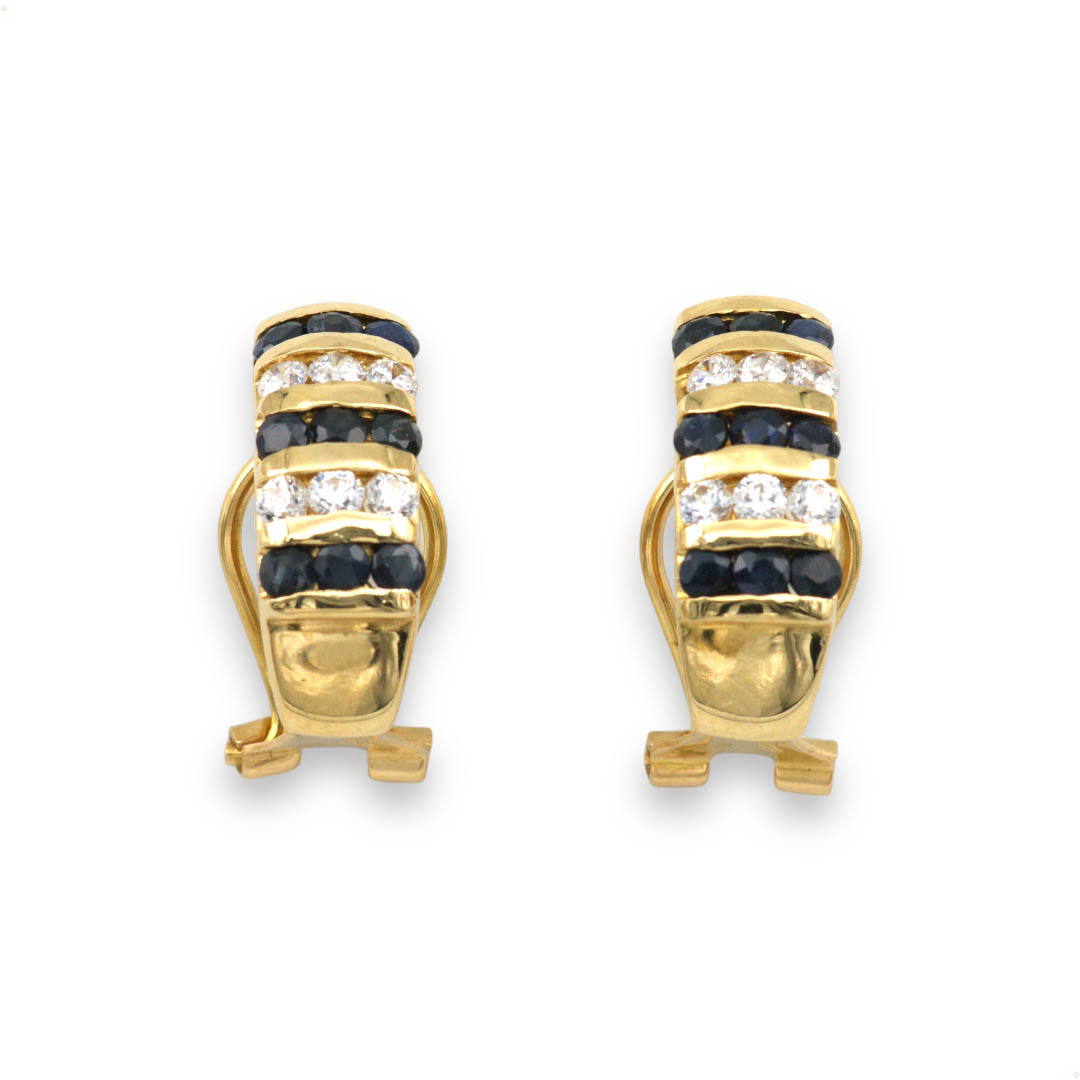Pendientes fabricados en Oro de 18 quilates intercalando filas de piedras negras y filas de circonitas todas bien engarzadas, acabado pulido y cierre omega. Diponible anillo a juego SKU80002604.