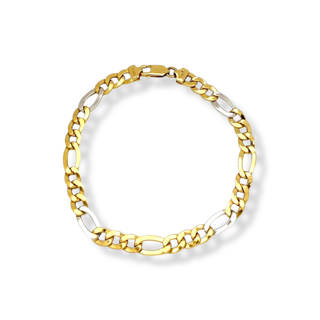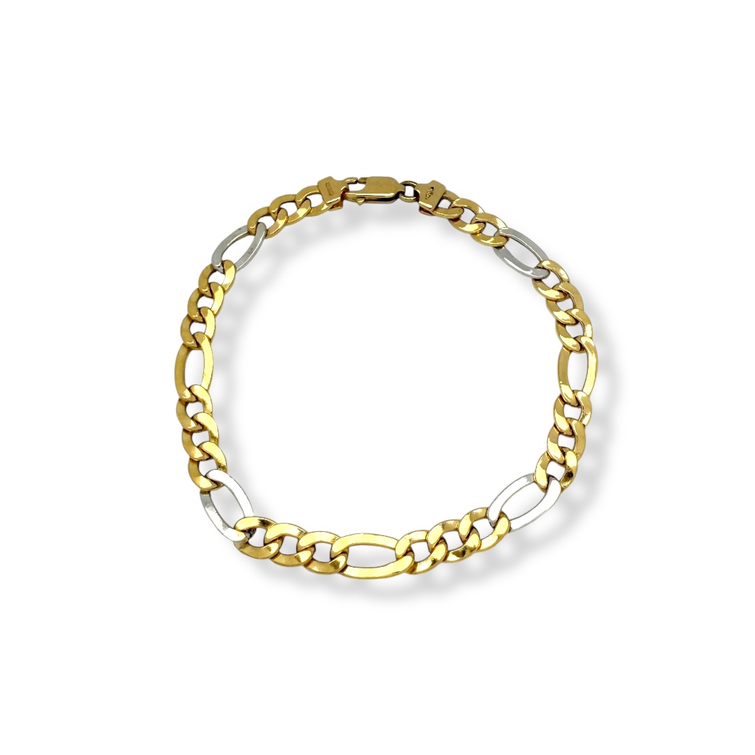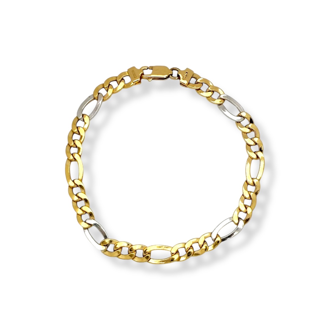Pulsera bicolor en Oro de 18 quilates con diseño de eslabones alternos barbada 3x1 con acabado pulido y cierre de mosquetón.