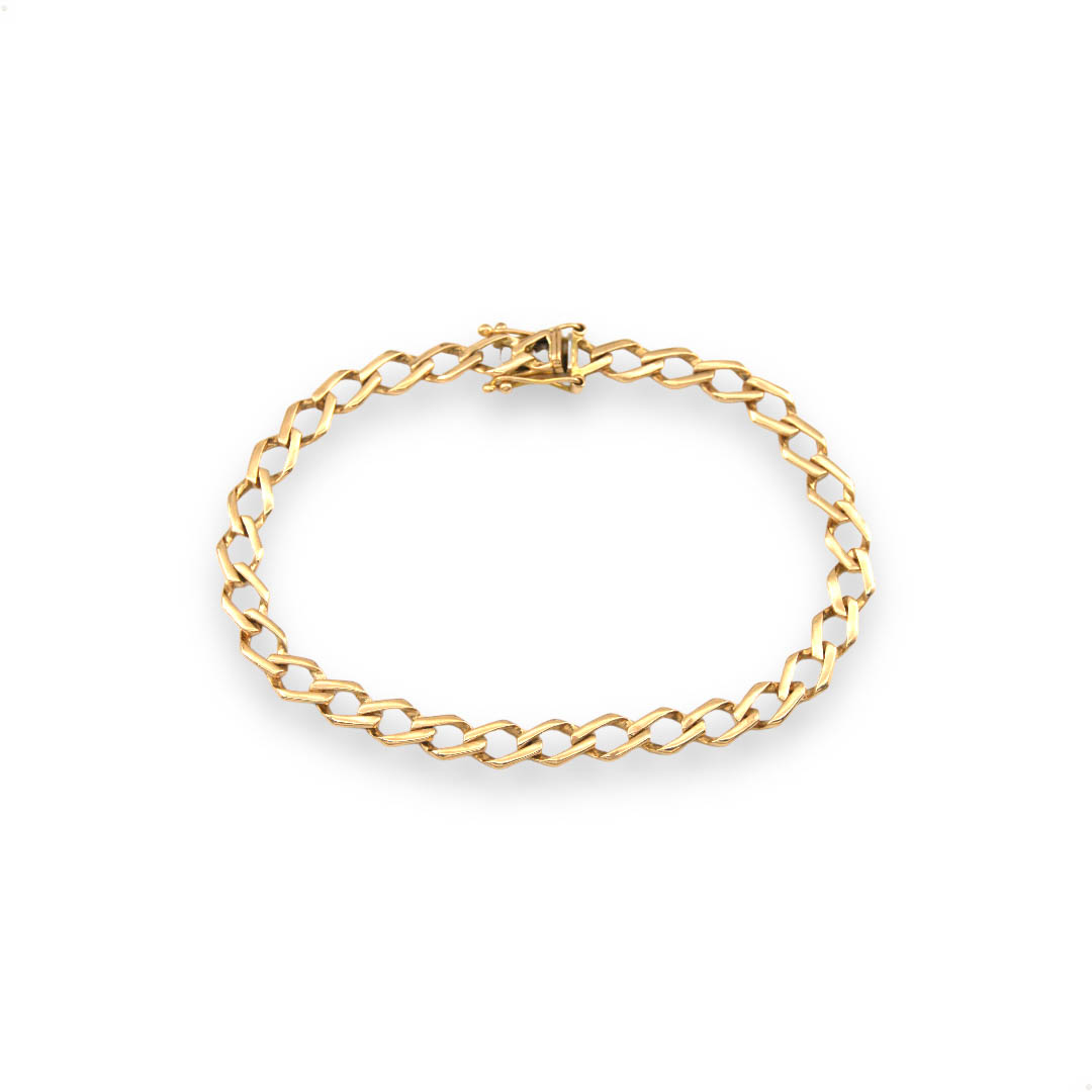 Pulsera fabricada en Oro de 18 quilates con diseño de eslabones de rombo, acabado pulido y cierre de caja.