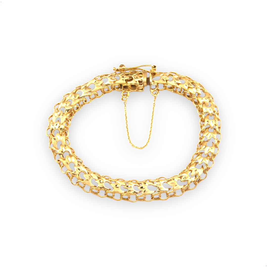 Pulsera princesa fabricada en Oro de 18 quilates con un bonito dibujo combinado de brillo y satinado, bordes de eslabones garibaldi. Cierre de caja con ocho y cadena de seguridad.