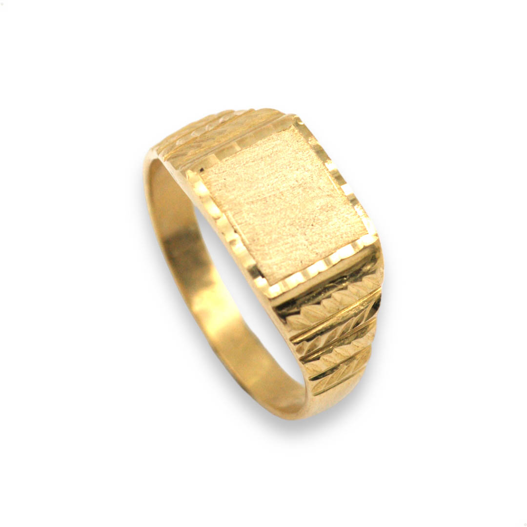 Sello fabricado en Oro de 18 quilates con zona para grabación cuadrada en acabado satinado y un diseño cuidadosamente tallado en los laterales en acabado pulido.