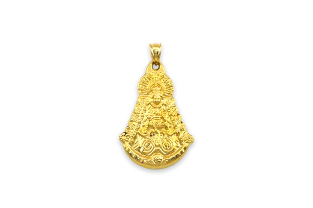 Colgante de la Virgen del Rocío fabricado en Oro de 18 quilates con todos los detalles tallados y en relieve destacando su acabado pulido.